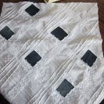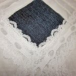 A kis négyzeteket kivágtam a párnahuzatból, és helyükre illesztettem a farmer négyzeteket, amiket nagyobbra vágtunk a varrásszél miatt. A varrást a már meglévő varrásokon vezettem, hogy ne rontsam el a csipke látványát.
